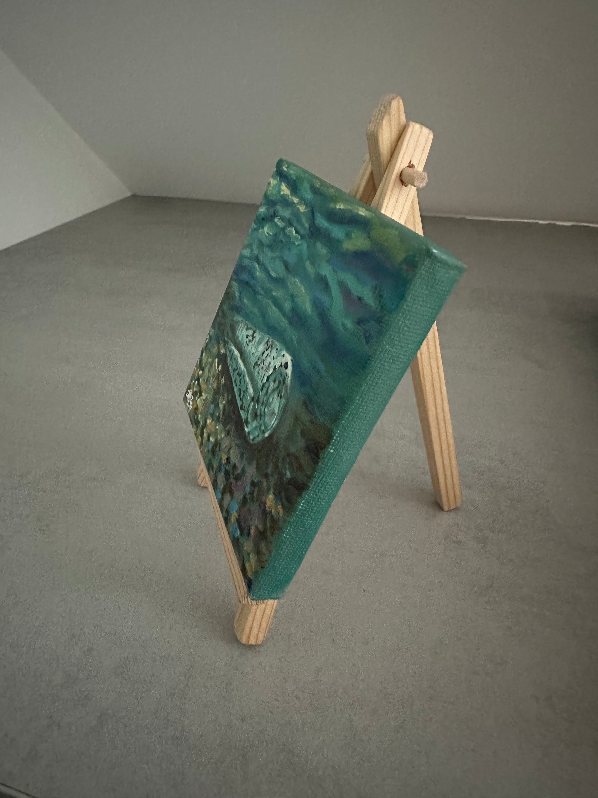 This mini oil painting features a seashell resting on the sand at the bottom of the blue ocean. It's a bit of fun! It comes with the small wooden easel.